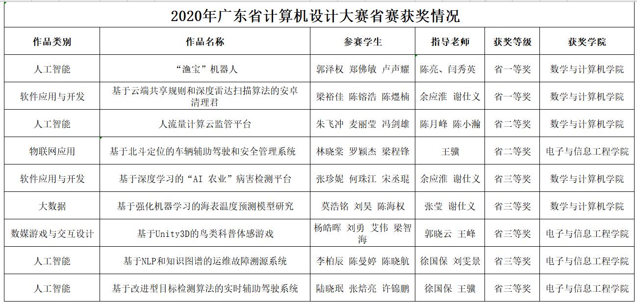 6月24日,由广东省教育厅主办的“2020年广东省老员工计算机设计大赛”落下帷幕。今年的比赛有来自广东省80多所本科院校共1129件作品参加。经过初评和复审两个环节,共评选出582件作品晋级省决赛。公司学子在比赛中不畏强手,奋力拼搏,最终获得广东省一等奖2项、二等奖2项、三等奖5项的好成绩。其中来自太阳成集团tyc122cc团队的《“渔宝”机器人》和《基于云端共享规则和深度雷达扫描算法的安卓清理君》两项作品勇夺省赛一等奖。