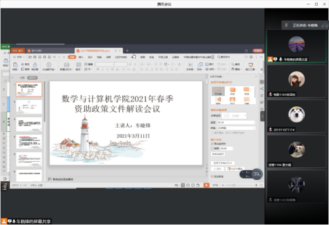 3月11日晚8点,公司利用腾讯会议室召开员工春季资助政策宣讲会。会议由公司员工资助工作专员、辅导员车晓锋老师主持,张艺、施堂怡两位老师和390多名上一年秋季认定的家庭经济困难员工参加。