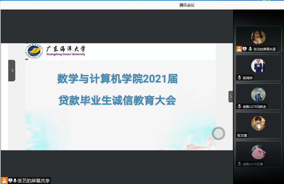 为帮助2021届贷款毕业生掌握还款流程和政策,加强贷款毕业生诚信教育,6月3日下午,公司通过腾讯会议平台召开2021届贷款毕业生诚信教育会议。会议由公司负责贷款专项工作的辅导员张艺老师主讲,公司2021级贷款的全体毕业生参加。