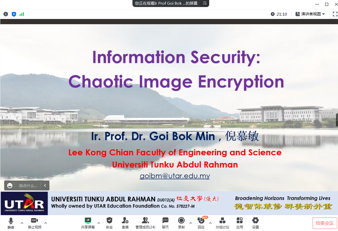 4月19日下午,应公司邀请,马来西亚拉曼大学副董事长、马来西亚科公司院士Bok-Min Goi教授通过腾讯会议在线为公司师生作了题为《信息安全-混沌图像加密》的学术报告,共有30名师生聆听报告。副董事长高秀梅教授致欢迎词,对Bok-Min Goi教授百忙之中为公司师生作学术报告表示感谢,并介绍了公司的基本情况、办学定位和办学特色。报告会由研究生院副经理叶国栋教授主持。