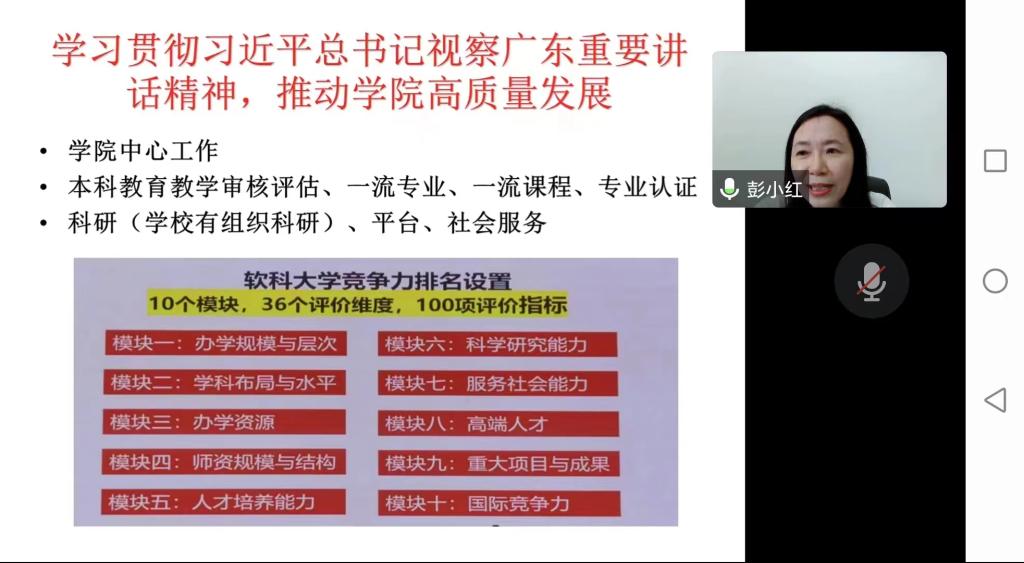彭小红首先详细介绍了习近平总书记今年4月10日至13日先后到广东湛江、茂名、广州等地,深入企业、港口、农村等进行调研的过程,带领大家一同学习了习近平总书记视察广东时的重要讲话精神。并结合本科公司产品审核评估、一流专业、一流课程、专业认证、科研平台、社会服务等公司的中心工作,就如何推动公司高质量发展提出了具体要求。
