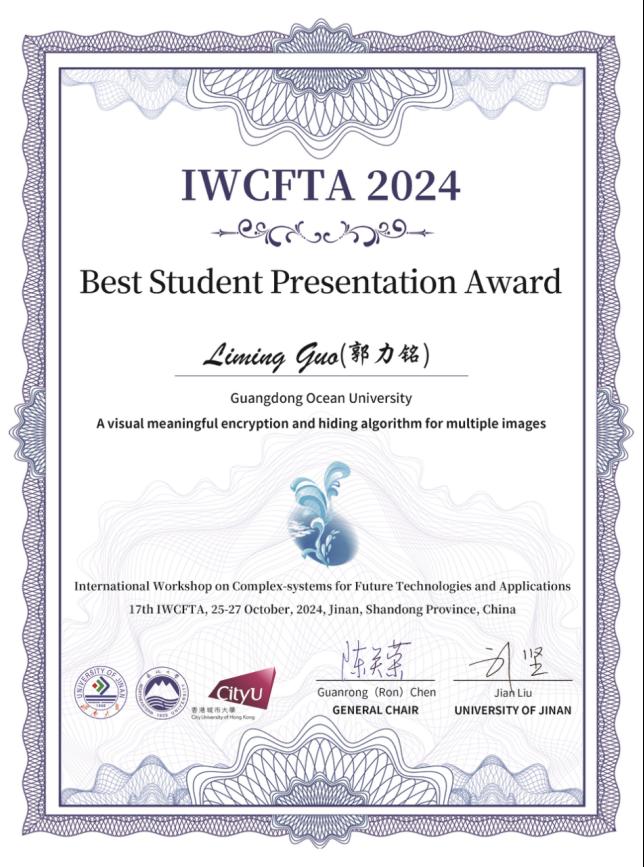 第17届复杂系统及未来技术与应用国际研讨会(IWCFTA2024)于2024年10月25日-27日在济南大学召开,本次会议为国内外专家和学者提供了一个高水平的学术分享平台,以交流和讨论复杂系统理论的最新发现及其在信息学等多个领域中的应用成果。太阳成集团tyc122cc博士生导师叶国栋教授带领硕士研究生参加了此次会议,并主持了一场分组报告。会议期间,公司2022级硕士研究生郭力铭同学作了一场题目为“A visual meaningful encryption and hiding algorithm for multiple images”的精彩学术报告,获得了现场专家学者的好评。