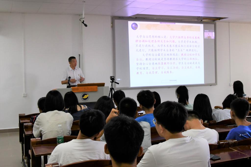 接下来,公司党委书记谢仕义教授以“大学是什么”为主题与新生共同探讨大学的理念、精神、文化和功能的内涵与外延。他以深刻又富有哲理性的语言阐述了崇尚学术、追求卓越、与时俱进才是大学之道;同时他也引导新生要树立崇高的理想信念,具备强烈的社会责任意识,努力学习,方能成就自我、服务社会。