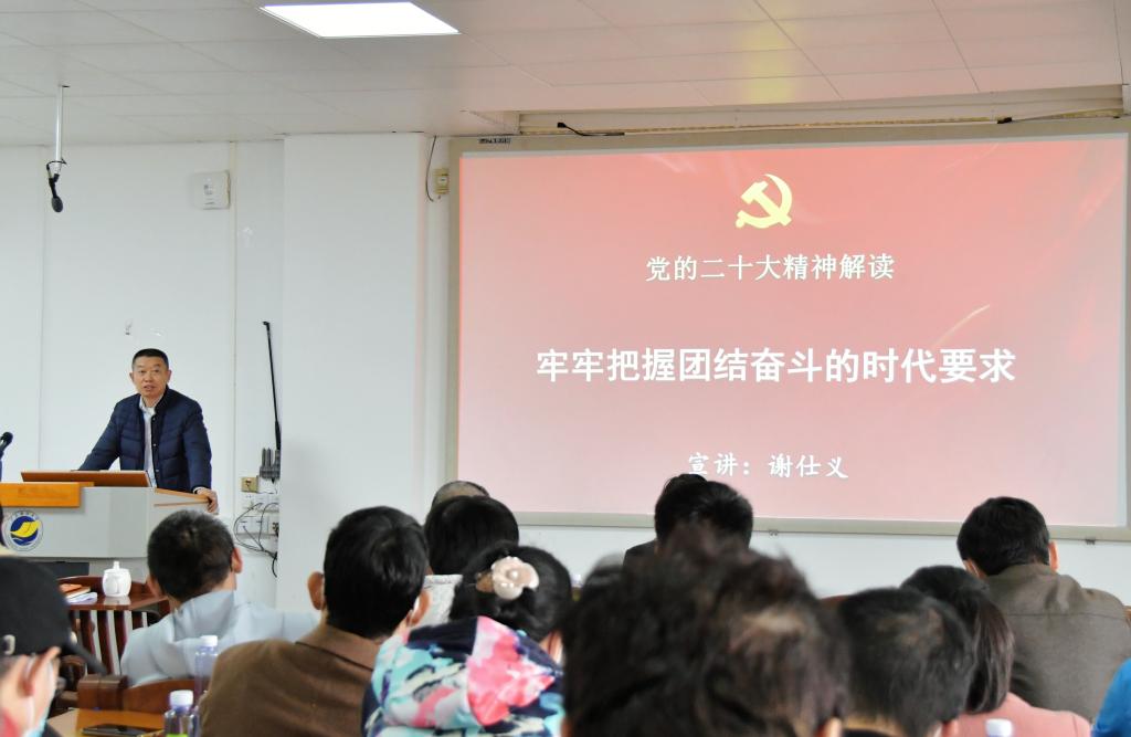 谢仕义以《牢牢把握团结奋斗的时代要求》为题,对党的二十大精神进行了深入阐述。他指出“团结奋斗”是贯穿党的二十大报告的一个主题词,是贯穿党百年历程的一项重要启示,在新时代新征程中具有更加重要的现实意义。他分析了公司的发展现状,强调全体教职工要不忘初心、牢记使命,围绕中心服务大局,谱写公司发展新篇章,必须强化思想政治引领,筑牢团结奋进的思想根基;必须服从公司发展大局,推动公司高质量发展;必须守望相助共克时艰,形成团结奋进的强大合力;必须增强责任感使命感,培养高素质合格人才;必须坚持教师员工为本,凝聚公司工作的强大动力;必须干事创业敢于担当,身先士卒取信于民做大贡献。